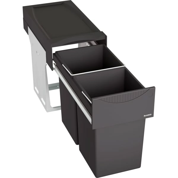 Avfallssystemet er for fleksibel montering i bunnen av et skap med hengslede dører, slik at bøttene er lett tilgjengelige når kjøkkendøren åpnes. Skyveuttrekket sørger for at bøttene kan trekkes helt ut, mens selve systemet forblir i bunnen av kjøkkenskapet. Skuffene har stort volum til tross for systemets kompakte dimensjoner.