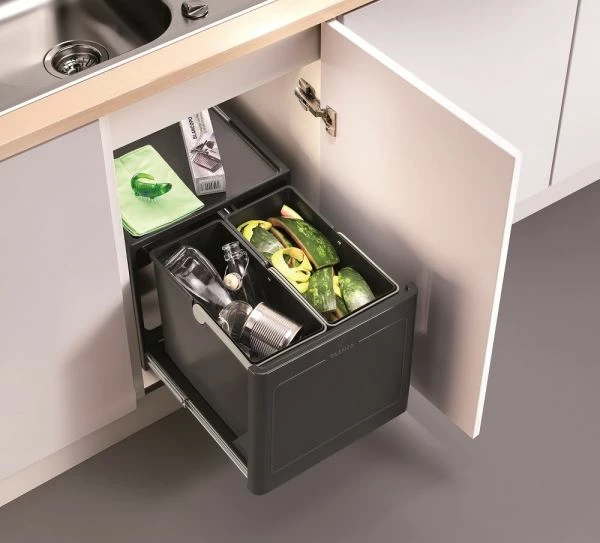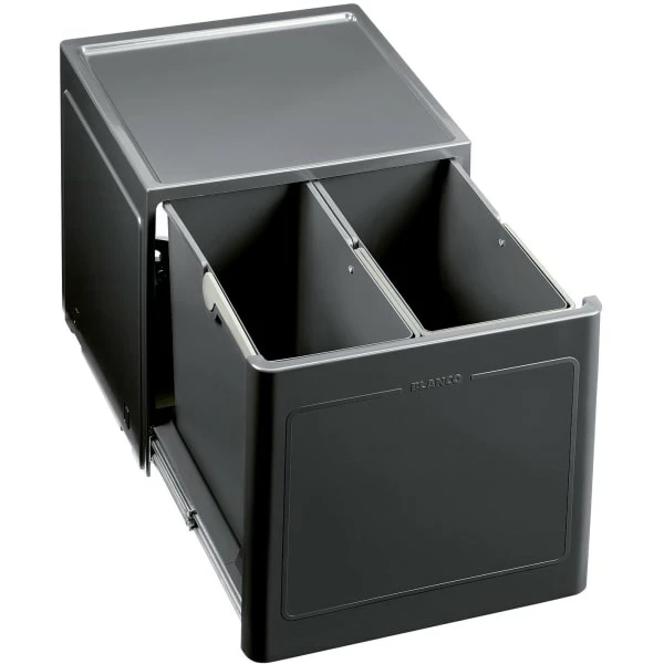 Med Blanco Botton Pro får du et robust avfallssystem i et attraktivt design med myke former. Avfallssystemet har manuell uttrekkingsfunksjon på hengslene. Det glidende uttrekket sørger for at spannene kan trekkes helt ut mens selve systemet forblir i kjøkkenskapet.