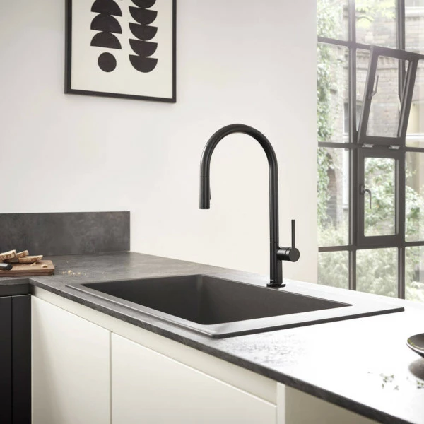 Stilrent og slankt kjøkkenarmatur fra Hansgrohe M54-serien med en fin matt svart overflate. Armaturet med den høye uttrekkbare tuten er praktisk når kjøkkenvasken skal rengjøres i alle hjørner, eller når salaten skal skylles. I tillegg er den uttrekkbare tuten også smart når servise, gryter osv. skal skylles etter bruk.